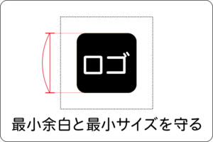 ロゴ周りに点線、最小余白スペースの周りに実線をつけると、下記のようになります。
